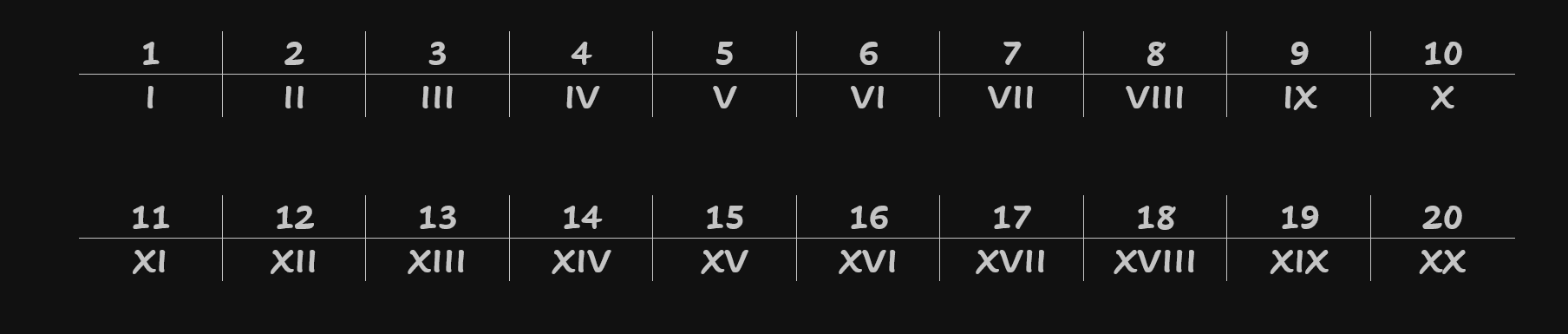 Das System setzt sich aus den lateinischen Buchstaben I (1), V (5), X (10), L (50), C (100), D (500) und M (1000) als Zahlzeichen zusammen, die Ziffer 0 gibt es nicht.